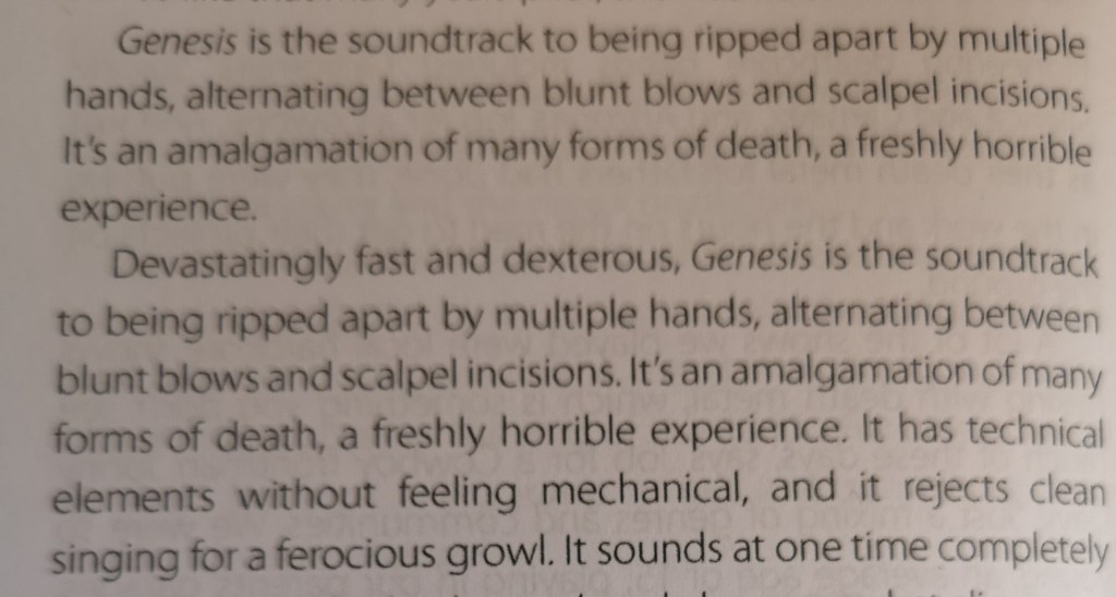 So finally, for the masochists amongst us, here’s the list of errors, stylistic quibbles, and bones of contention that I spotted on the first read, there may well be more. This is not (entirely) intended to be a “gotcha” list. But ‘Death Metal’ is a published work that I paid money for. My own writing is riddled with typos and dubious claims, but I don’t have an editor, it’s free, and my essays are very clearly partisan. My writing is not aimed at a general audience. This book is.