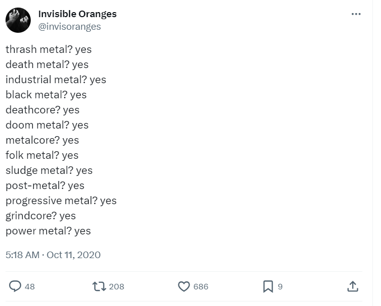 Antagonism between artist and critic is a good barometer of a culture’s health. And for metal, this boundary – between the generators of content (i.e. the artist and associated pluggers) and the critics charged with evaluating said content – has all but collapsed, intertwined in a symbiosis of sponsorship deals, information sharing, and mutual platforming. Whilst a strong case could be made that this informal, spontaneous, organic form of networking is the very stuff of an underground renaissance, it comes at a price. Namely the ejection of negativity in any and all coverage through fear of ostracization. The unpredictable and unaccountable views of underground platforms are anathema to the constant stream of positivity required to grow a brand. Until you end up with sites like Brooklyn Vegan’s Invisible Oranges gaining hegemonic traction, whose recent 43 Metal Albums We’re Anticipating in 2024 reads like a who’s who of tedious indie dilettantes.